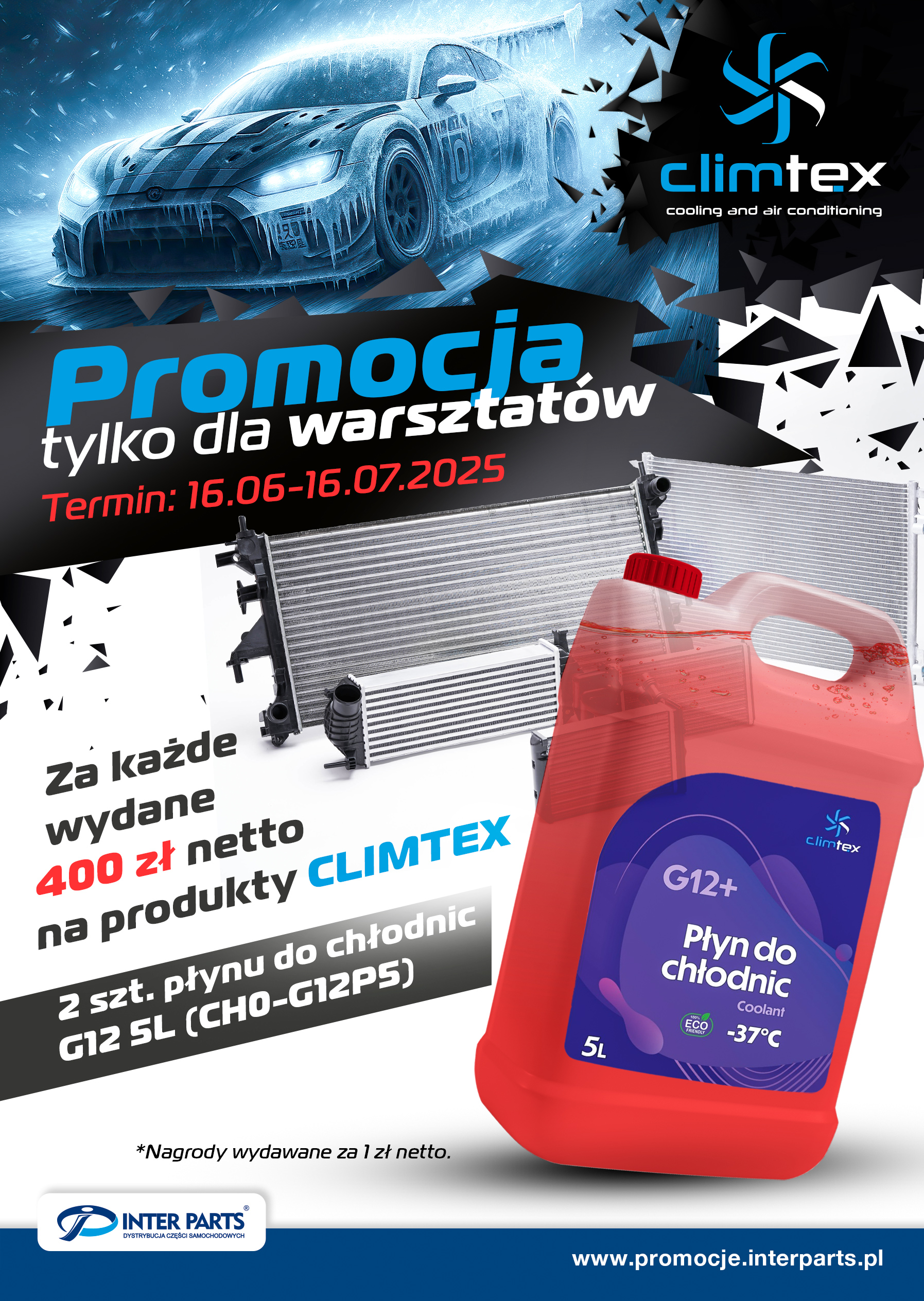 Przy zakupach produktów Climtex o wartości 400 netto otrzymasz 2 szt. płynu do chłodnic G12 5L (CHO-G12P5) za 1 zł netto.