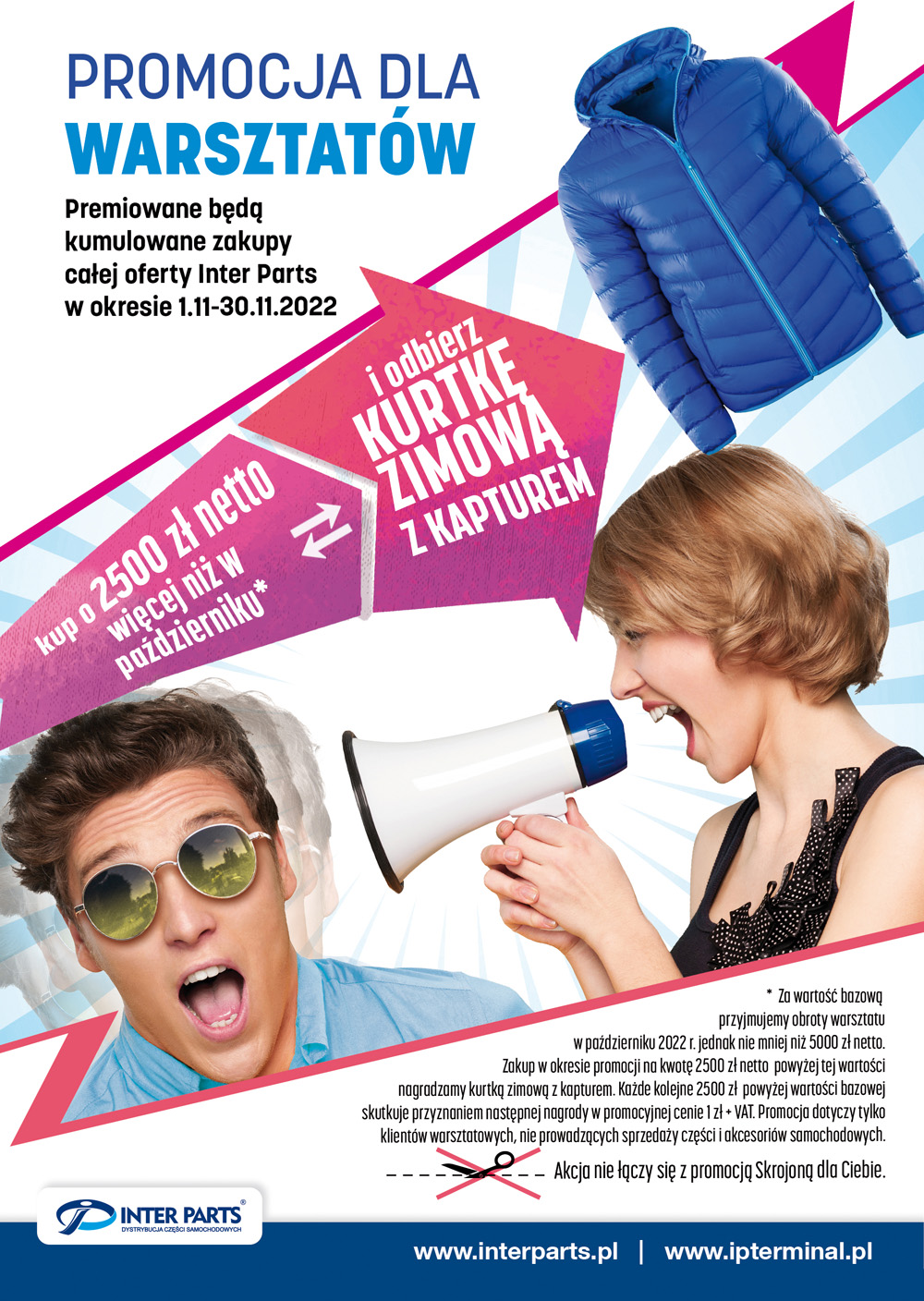 Za osiągnięcie w listopadzie wzrostu obrotów o 2500 złotych netto, w porównaniu do października br., klient warsztatowy otrzyma pikowaną kurtkę jesienno-zimową z kapturem. Kolejne 2500 złotych netto obrotu to kolejna kurtka!